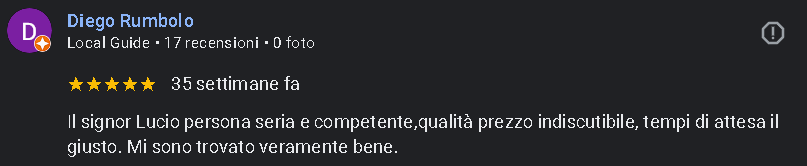Il signor Lucio persona seria e competente, qualità prezzo indiscutibile tempi di attesa il giusto. Mi sono trovato veramente bene